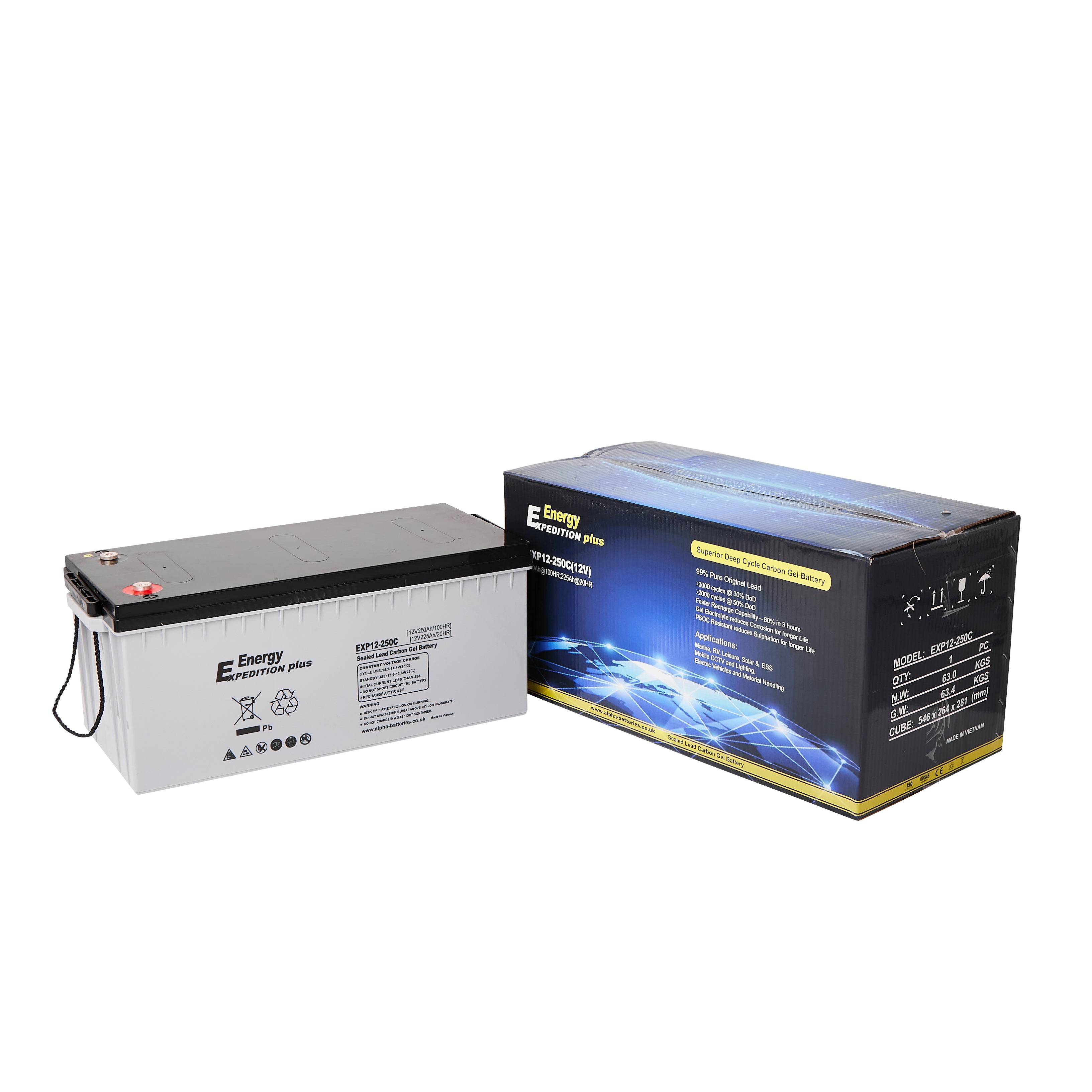 For installations requiring the highest capacity in the Expedition range, the 250 Ah lead‑carbon GEL battery provides long‑duration power and the same fast‑charging, long‑cycle performance as smaller models. The battery uses activated carbon and graphene on the negative plate to combine lead‑acid chemistry with super‑capacitor behaviour, giving more than 1 500 cycles at 50 % depth of discharge.