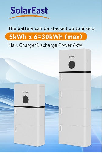 - SolarEast PowerCool-LFP-VLV 5.12kWh LONG LIFE LIFEPO4 HIGH-EFFICIENCY STORAGE BATTERY has a 5 years product warranty (95% Depth of Discharge); Storage capacity is expandable to 20.48kWh (4 modules in one stack); Easy plug & play installation.