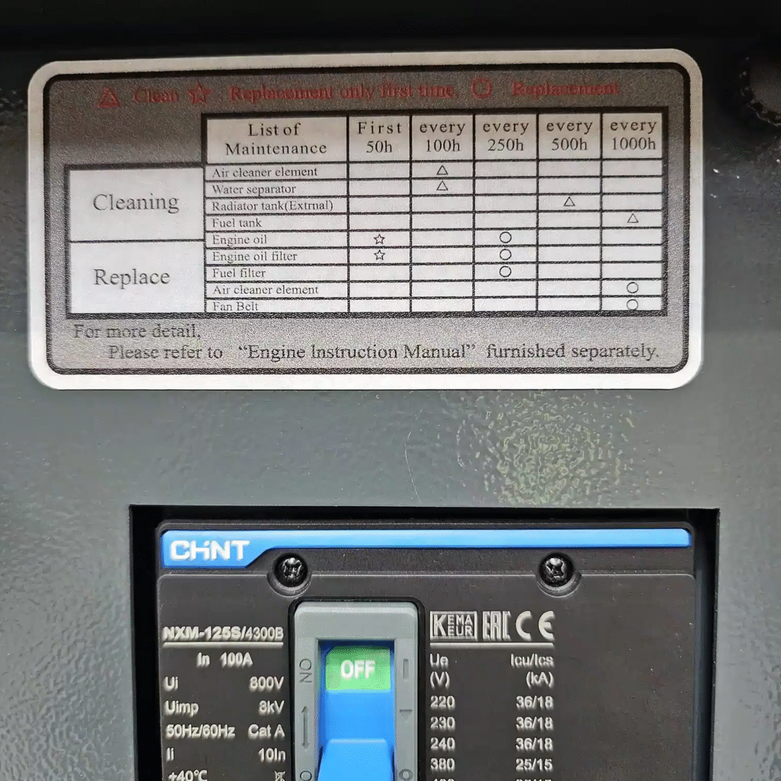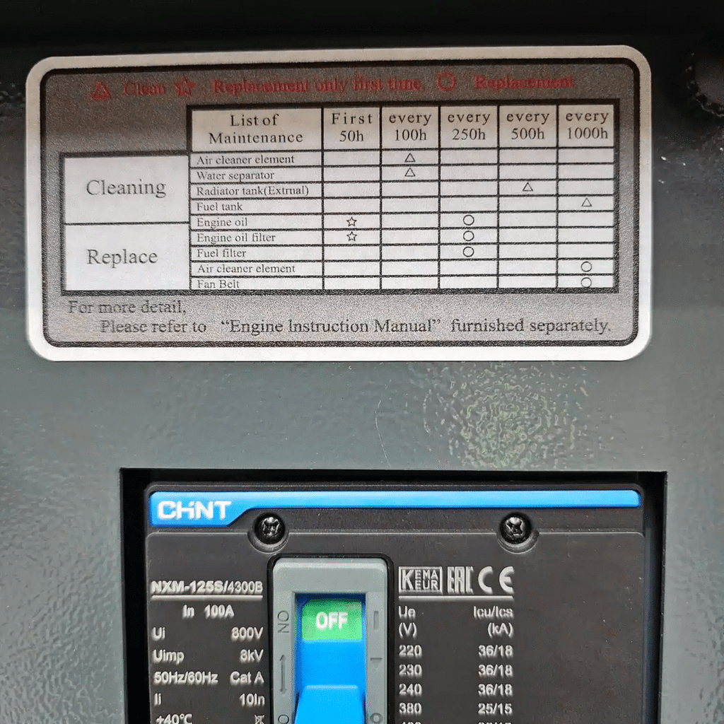 - Practical runtime: Integrated 71.4 L base fuel tank; around 13 hours at 100 % load (≈5.48 L/h).