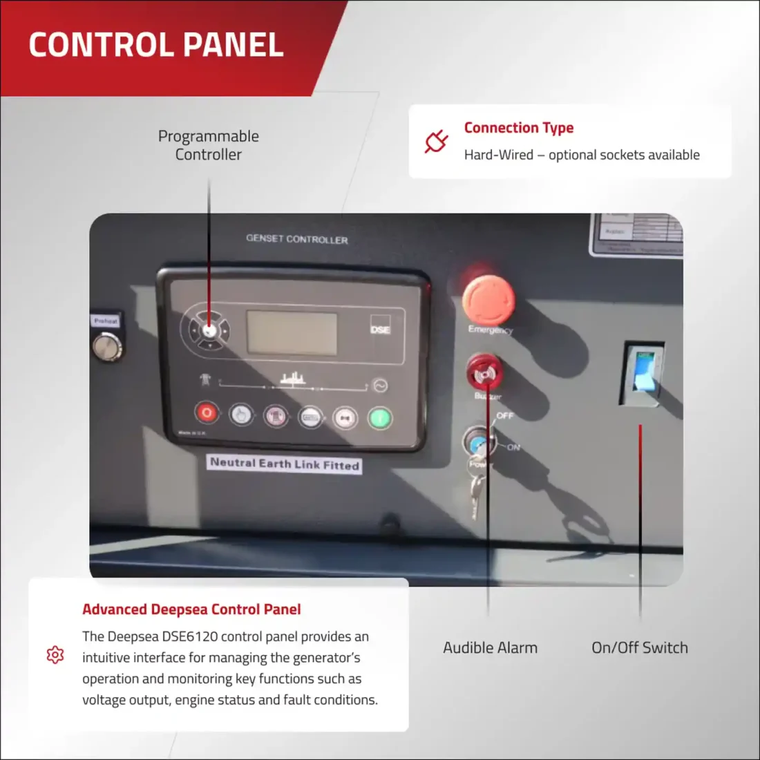 - Easy control: Deepsea DSE6120 control panel supporting manual and automatic (AMF/ATS) operation.