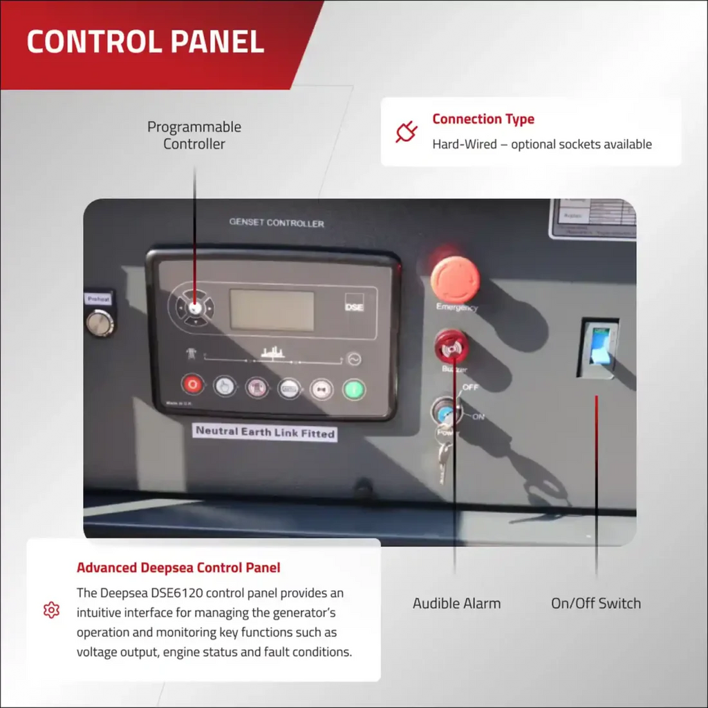 - Deepsea DSE6120 controller: Full-featured digital control with monitoring, alarms and AMF capability.