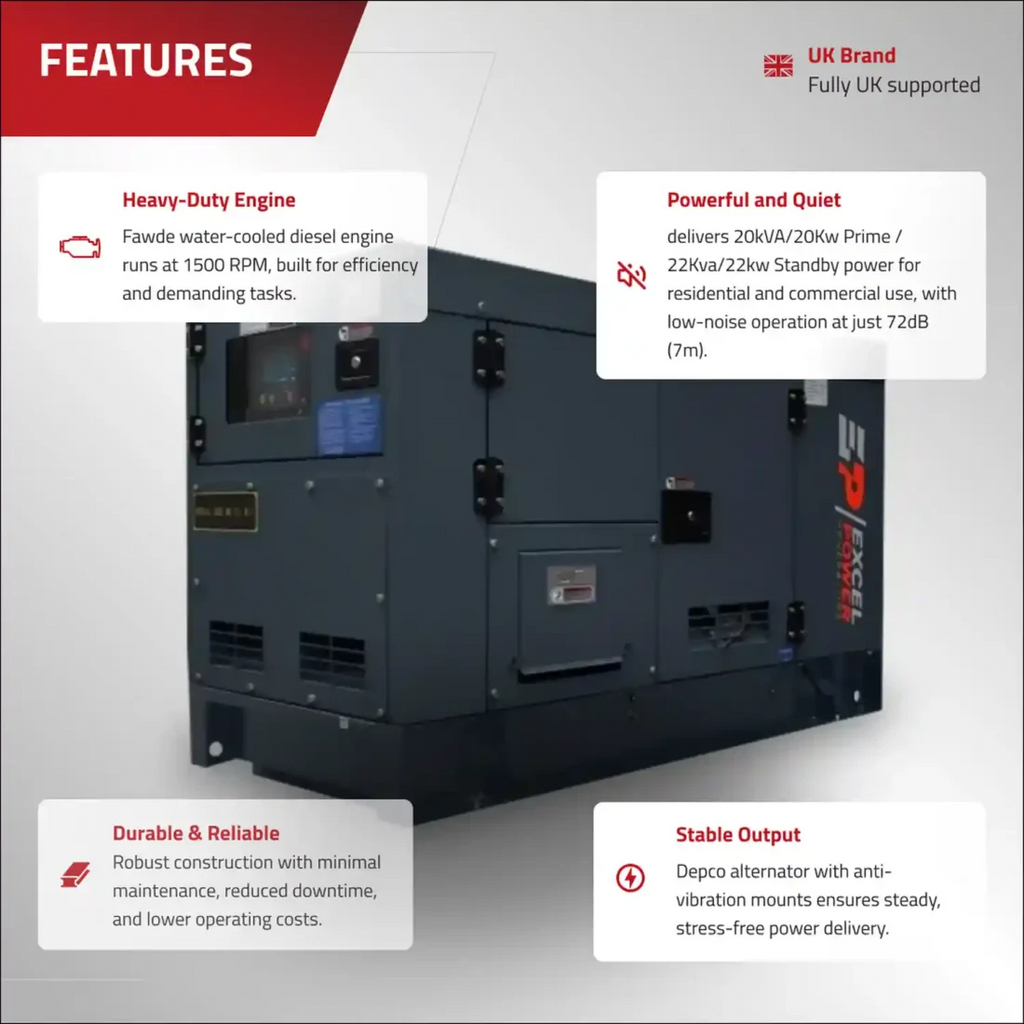 The Excel Power XL-DFAW-22S is a robust, water-cooled diesel generator designed for dependable standby and light prime applications. With a compact acoustic canopy, heavy-duty Fawde engine and high-quality Depco alternator, it’s a smart choice for homes, farms, workshops, site offices and small commercial premises that cannot afford to be without power when the mains fails.
