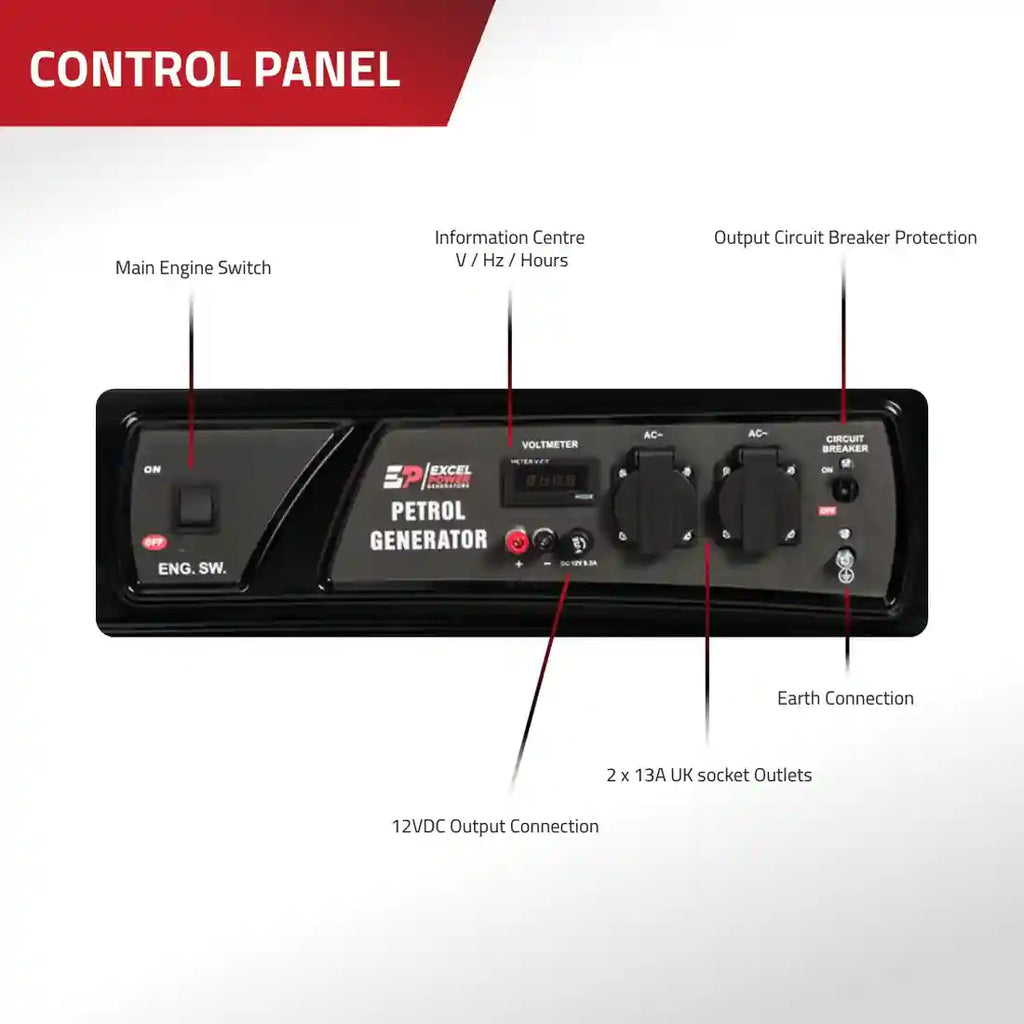 The Excel Power XL3000E is a compact, open-frame petrol generator designed for reliable 230–240 V single-phase power in a tough, easy-to-handle package. With 3 000 W starting output and 2 800 W rated power, it is ideal for garden machinery, light trade tools, DIY projects and backup power for sheds, garages and small home loads.