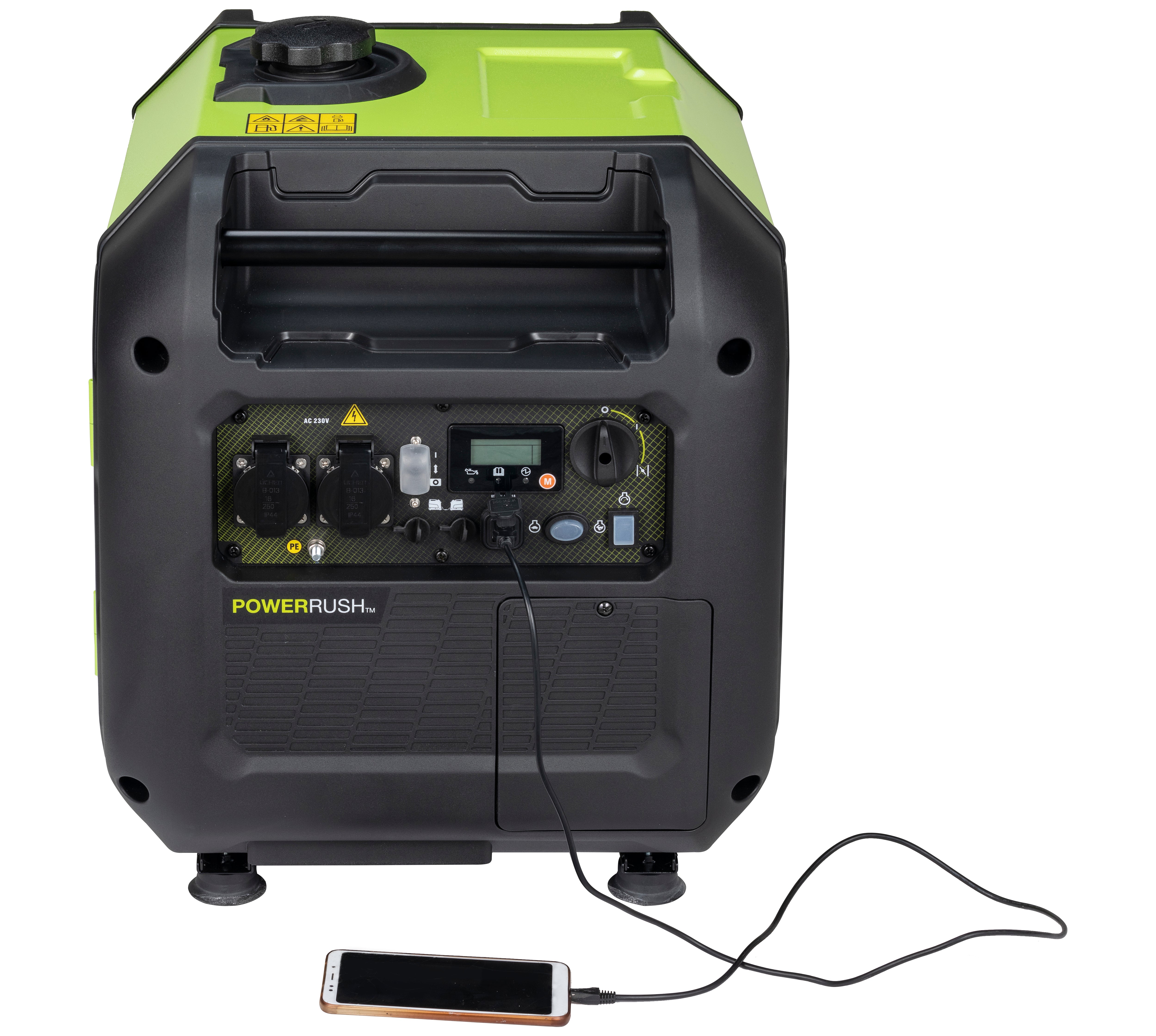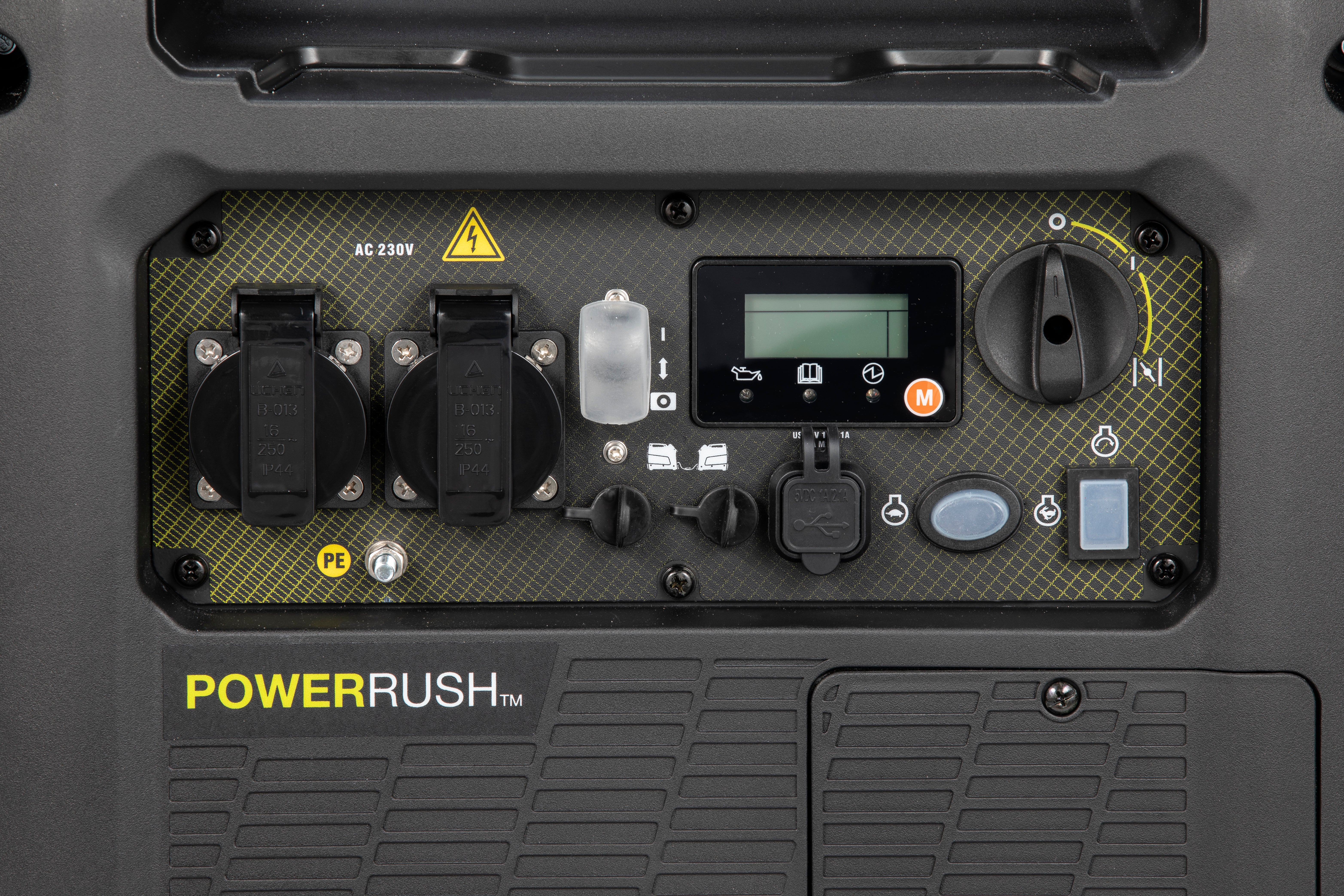- Control Panel: Voltage/frequency/hourmeter, output and warning LEDs