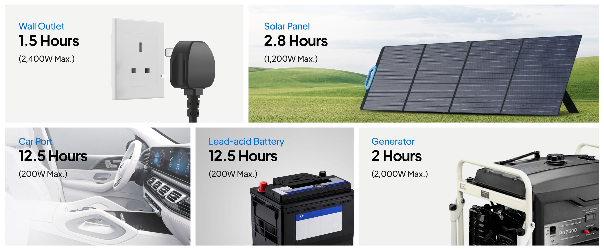 Solar Panel (s) (1200W): | ≈2.5 Hours (With prime sunshine, ideal orientation and low temperature) |